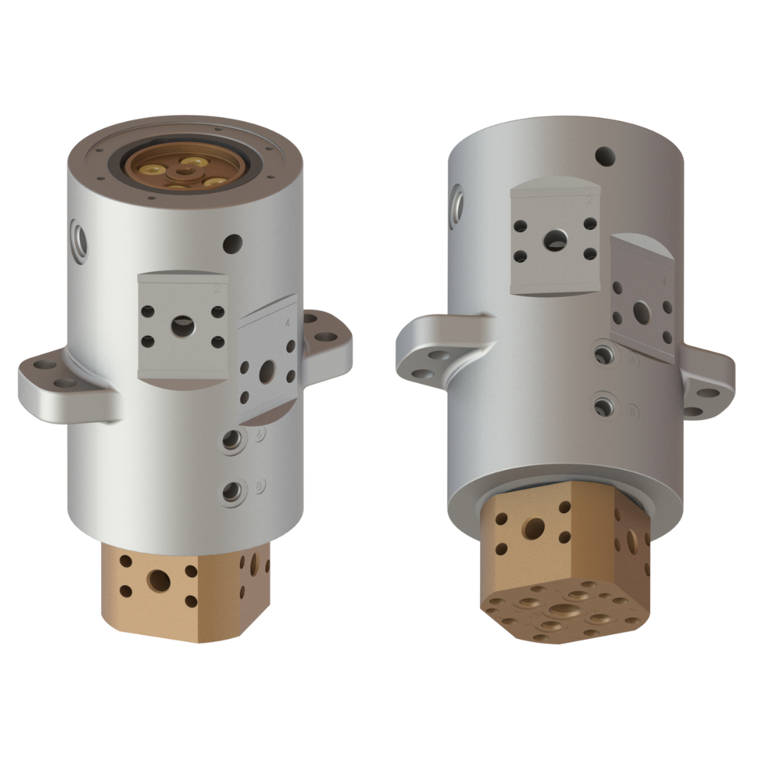 Optimized hydraulic rotary for small excavator machines. Featuring 4 high-flow passes for track drives, as well as motor case drain, high-low shift, and 2 blade control passes. Rotary venting and case are internally connected to the tank for zero rotary maintenance.